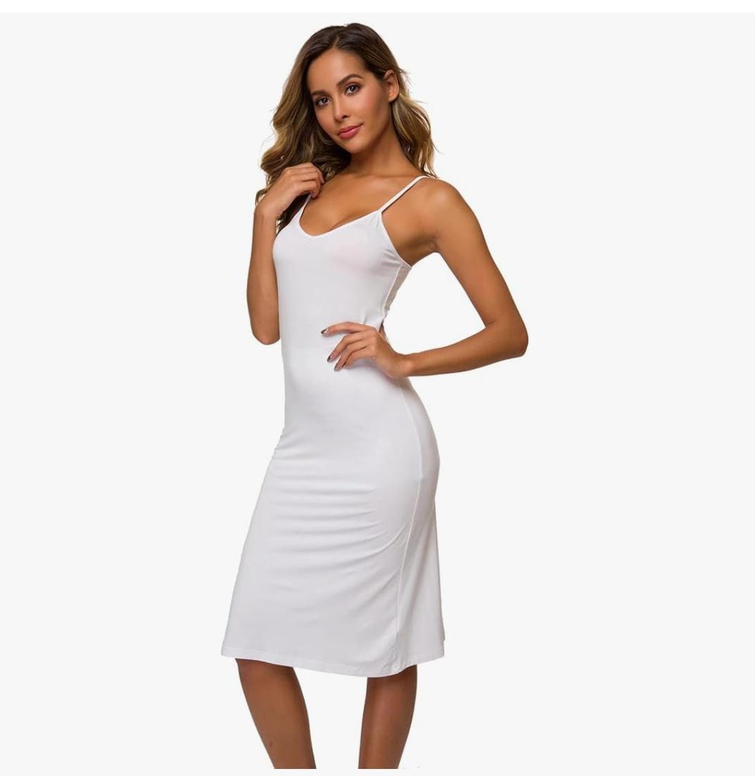 Slip Dress with adjustable spaghetti straps. Knee Length and made from rayon and spandex so they're extremely soft and stretchy. Running true to size for women's and if you want a more fitted bodycon style look then size down one.