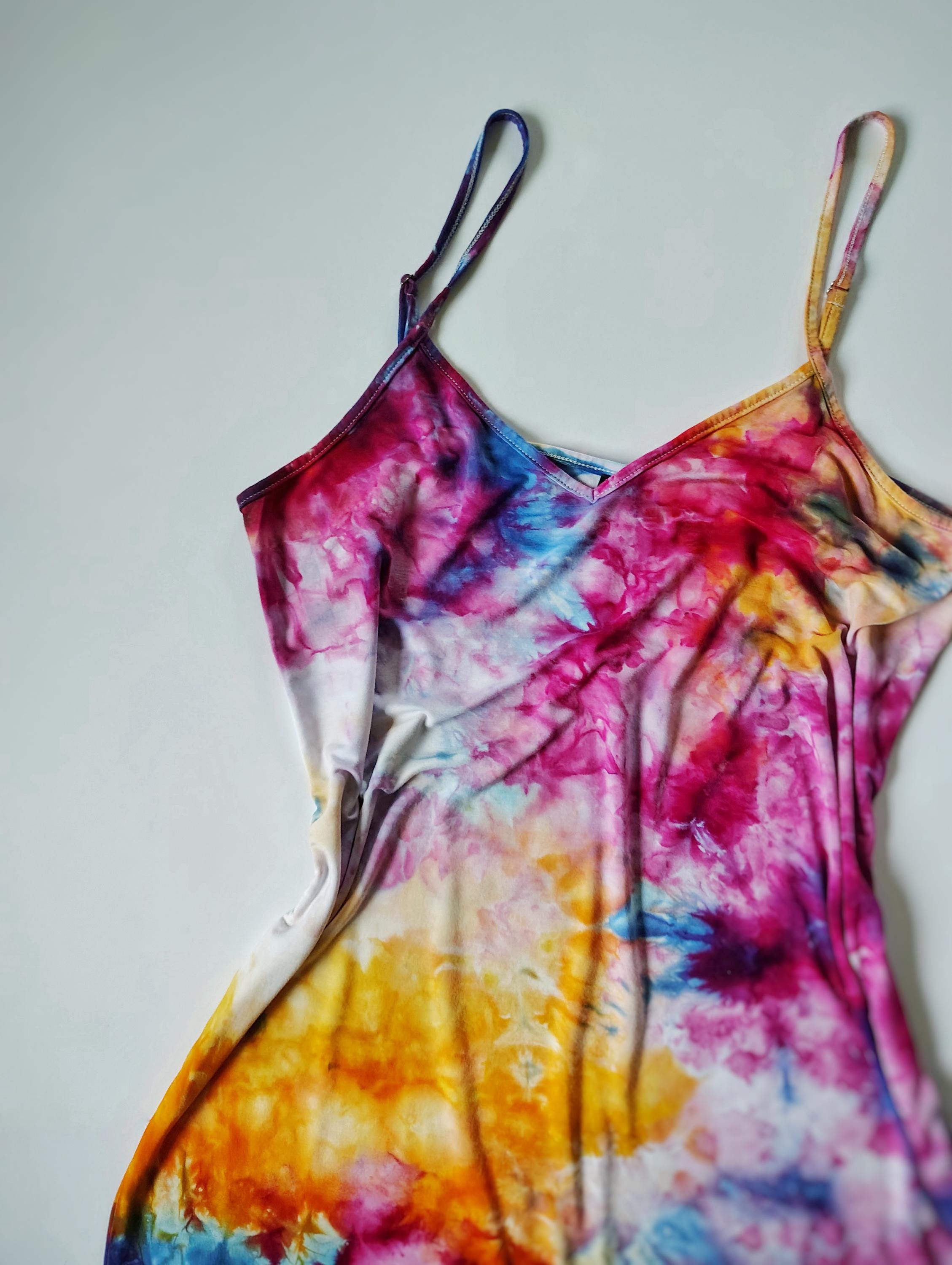 Handmade Tie Dye Slip Dress – Colorful Ice Dye Spaghetti Strap Mini Dress, Festival Outfit, Summer Boho Clothing, Unique One of a Kind Dress