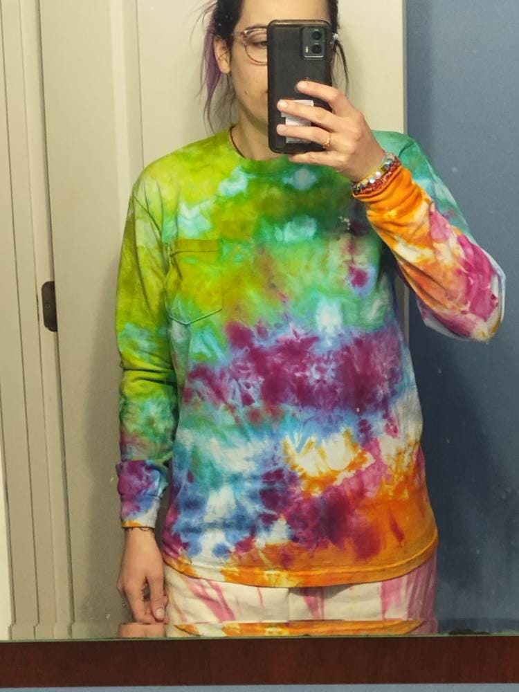 Long sleeve rainbow tie dye shirt, festival fashion, artisan batched hand dyed clothing