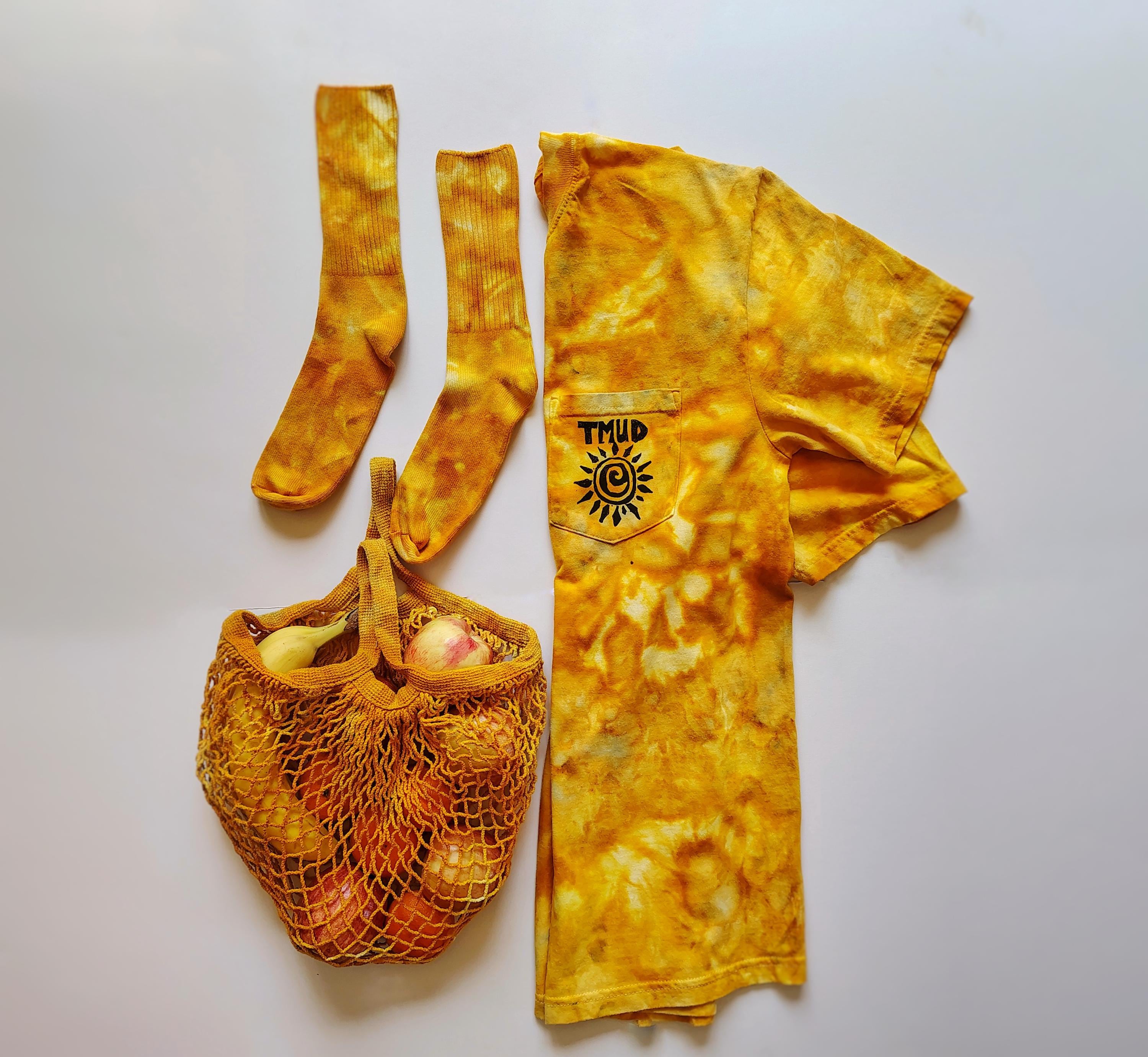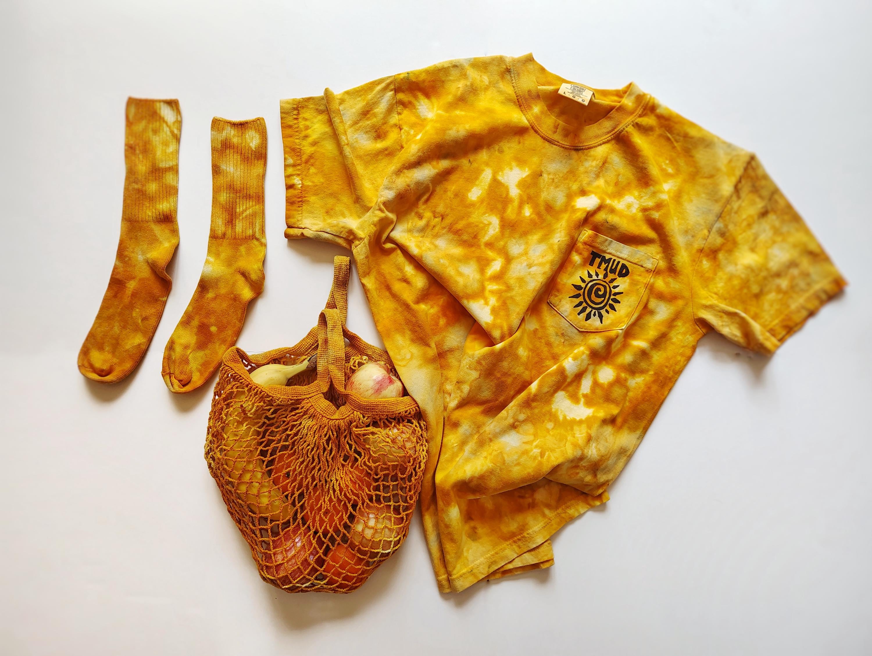 ✅ A hand-stamped pocket tee dyed in Marigold and Daffodil Yellow