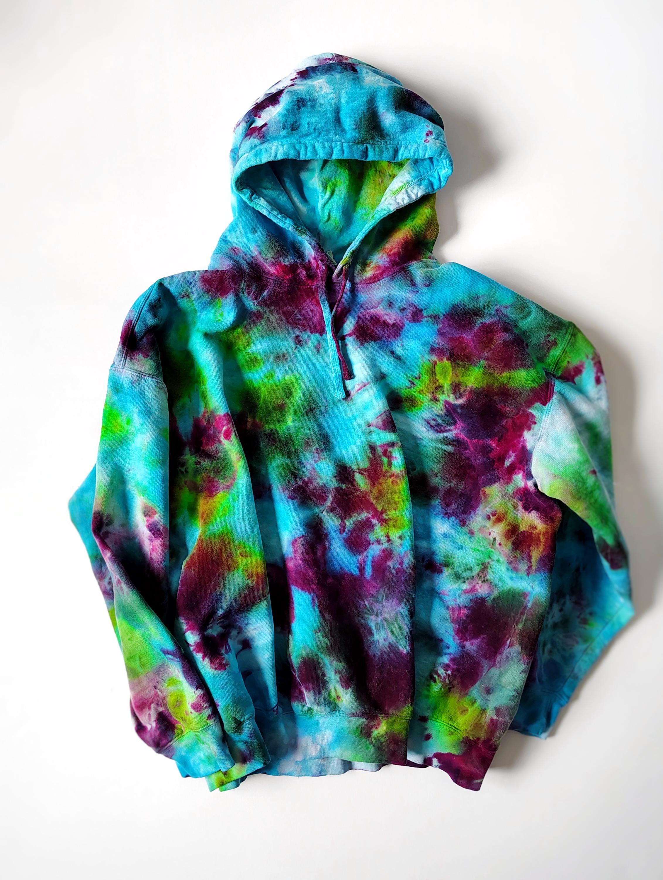 All of my work is ice dyed, so I work with the powder form of dye and place ice on top for the melt to slowly dye the fabric to create a watercolor affect. This means colors can split into individual color components.