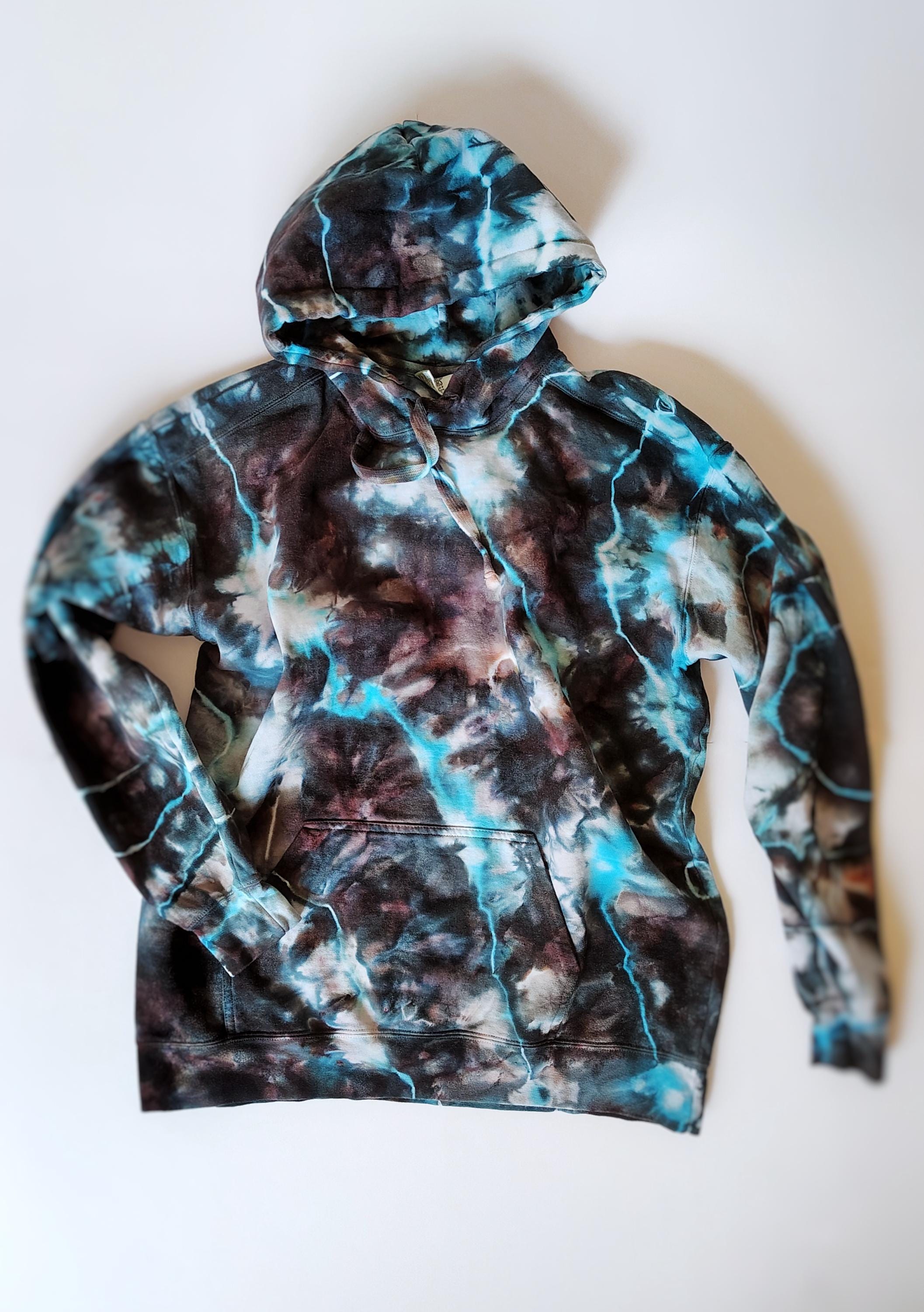 Another AMAZING hoodie from this shop! I bought this one for my husband, and he LOVES it. Once again, the picture gives a great idea of what to expect, but it is so much better in person. What appears to be only black in the photo is actually a beautiful mix of dark, stormy shades. There are shades of black and deep grey, along with plum and deep blue. The turquoise is bright and clear, and contrasts beautifully with the dark shades. It also has shocks of white throughout. The entire scheme is gorgeous altogether. The hoodie itself is thick and warm, and comfortably breathable due to the high cotton content. Shipping was prompt for custom items, as always. I’m thrilled with my purchase, and happy to recommend this shop!