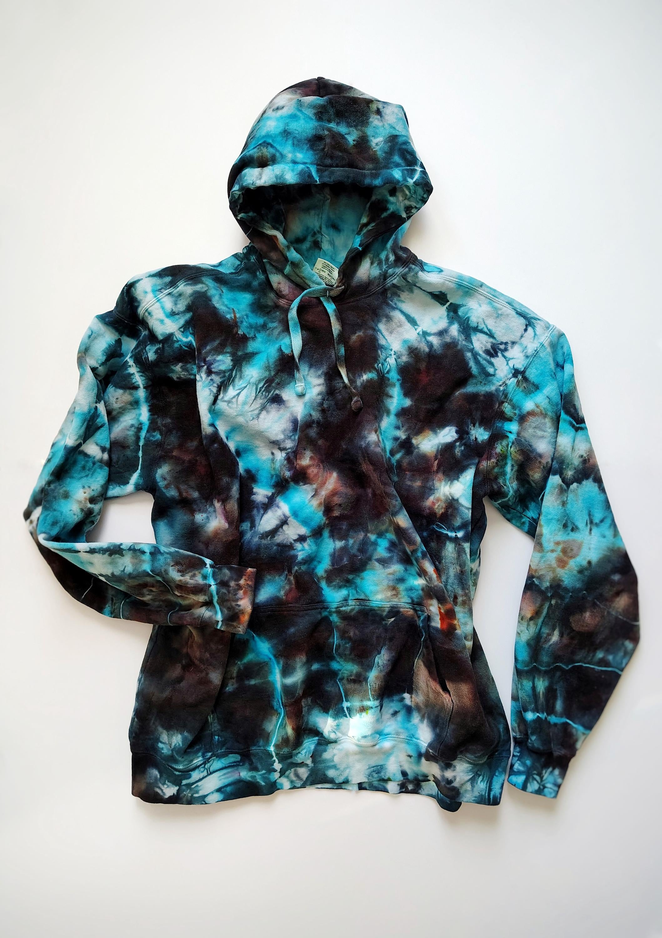 Another AMAZING hoodie from this shop! I bought this one for my husband, and he LOVES it. Once again, the picture gives a great idea of what to expect, but it is so much better in person. What appears to be only black in the photo is actually a beautiful mix of dark, stormy shades. There are shades of black and deep grey, along with plum and deep blue. The turquoise is bright and clear, and contrasts beautifully with the dark shades. It also has shocks of white throughout. The entire scheme is gorgeous altogether. The hoodie itself is thick and warm, and comfortably breathable due to the high cotton content. Shipping was prompt for custom items, as always. I’m thrilled with my purchase, and happy to recommend this shop!
