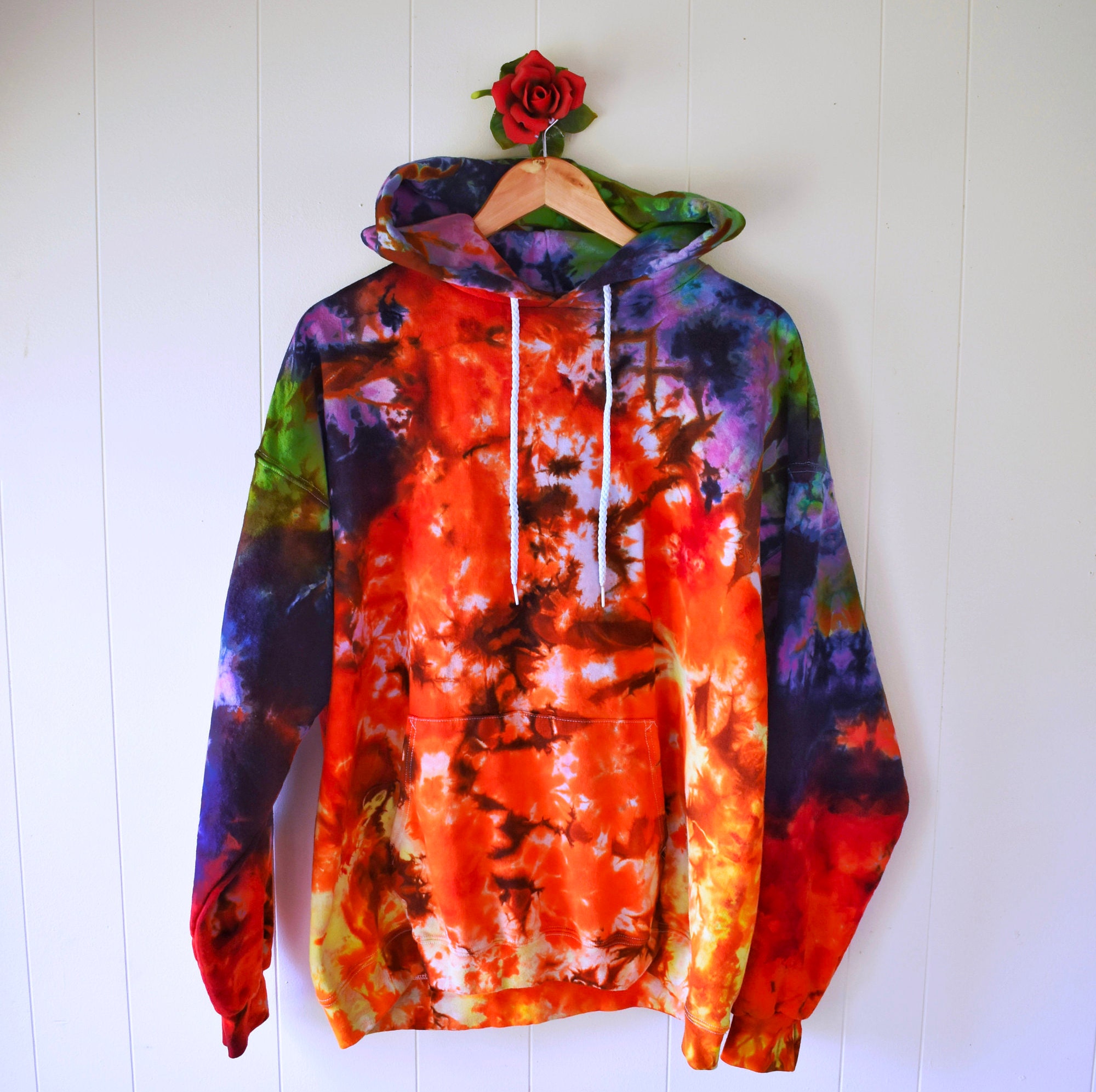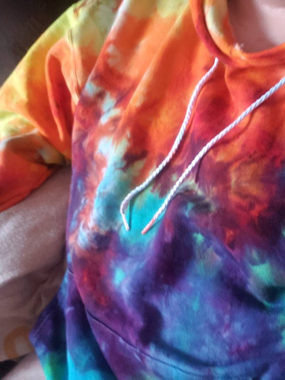 Another awesome hoodie! The picture shows a hoodie that appears mainly orange, green, and purple. So I was pleasantly surprised to see additional shades of blue, red, and yellow. The colors are bright and vibrant, no muddiness as sometimes happens with multicolor tie dye, and the white spots are minimal. I machine washed the hoodie as instructed, and there was no noticeable fading of the beautiful colors. I love this particular brand, as the high cotton content is warm and comfortably breathable, and holds color very well. Iβve washed a previously ordered hoodie from this shop a few times now, and it still looks as good as it did right out of the package. Shipping was prompt as well, especially considering that the item was custom made. Iβm very pleased with my purchase, and look forward to ordering again from this lovely shop!