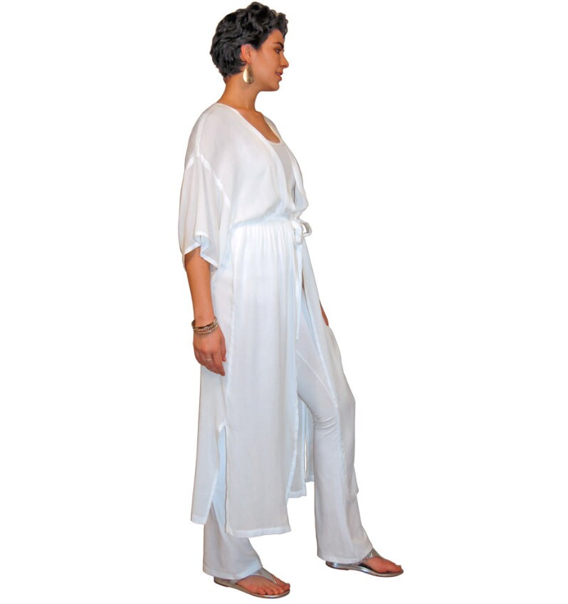 A long kimono style open front coat with a fully elastic raised waistline and attached front ties.